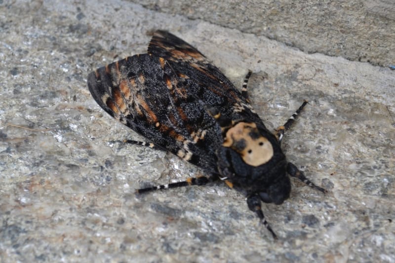 Acherontia atropos è una farfalla notturna di grandi dimensioni, con un’apertura alare che può superare i 10 centimetri. La sua colorazione è varia, con tonalità di grigio, marrone e rosa, e presenta la caratteristica macchia a forma di teschio sulla parte anteriore dell’addome.